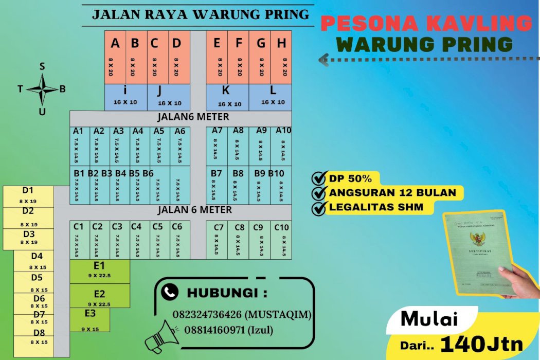 Luas Tanah: 8,150 M2Mencari investasi cerdas atau tempat tinggal idaman? Kavling siap bangun di Warung Pring adalah jawabannya! Dengan lokasi yang strategis dan akses yang mudah, Anda akan menemukan lingkungan asri yang akan membawa kenyamanan bagi Anda dan keluarga. Berikut adalah beberapa keunggulan dari kavling yang ditawarkan :- Harga yang Kompetitif: Mulai dari Rp 140.000.000.- Luas Tanah yang Luas: Sekitar 8.150 m siap untuk Anda kembangkan.- Legalitas Terjamin: Sertifikat Hak Milik (SHM) per bidang atas nama pembeli, menjamin investasi Anda aman.- Kawasan Padat Penduduk: Lingkungan sekitar yang berkembang dengan banyak fasilitas dan perekonomian yang aktif.- Fasilitas Terdekat: Hanya beberapa langkah dari Alfamart, Indomart, dan Bank BRI, memudahkan aktivitas sehari-hari Anda.Alamat lengkap kavling ini berada di: Jl. Raya Warungpring, Warungpring, Kec. Moga, Kabupaten Pemalang, Jawa Tengah 52354.Jangan lewatkan kesempatan emas ini! Unit terbatas dan permintaan semakin tinggi. Hubungi kami sekarang untuk informasi lebih lanjut dan survei lokasi gratis!#tanahkavlingbaru #tanahkavlingterlaris #tanahkavlingterbaru #tanahkavlingdijual #tanahkavlingpemalang #tanahkavlingmoga